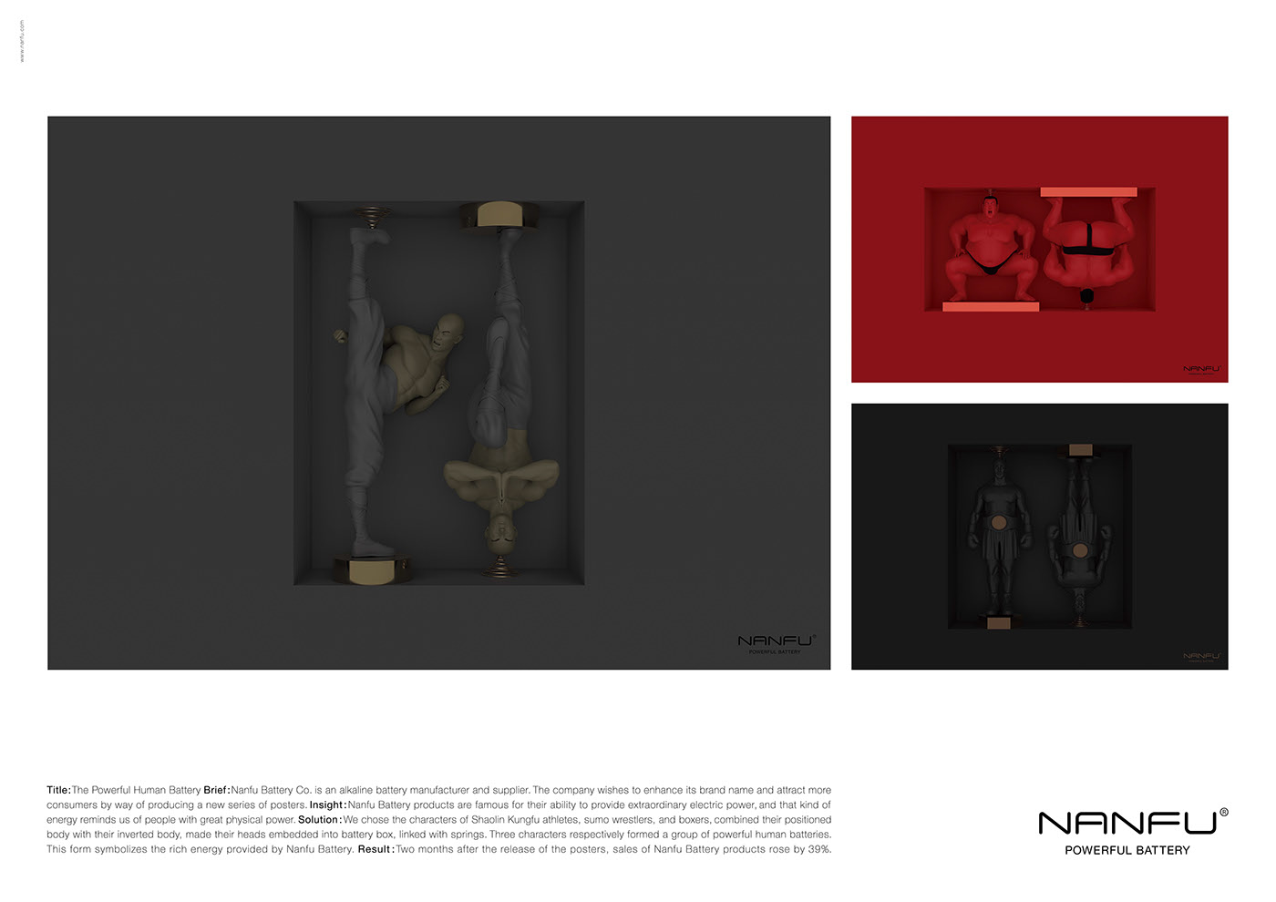 📸选用充满力量的少林功夫高手、相扑选手、拳击手的形象,使用3维图形设计,将他们身体颠倒组合,头顶弹簧嵌入电池盒中,形成一组组强壮的人体电池,夸张地展现了南孚电池强劲的电力。