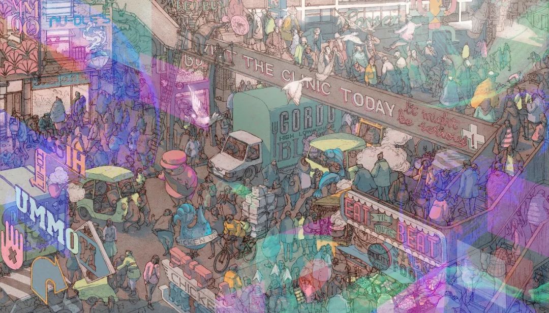 其中和书有关的是 《Square Eyes》 广场之眼,整个画面给我一种眼睛里塞进了五彩斑斓肥皂泡的迷离感。