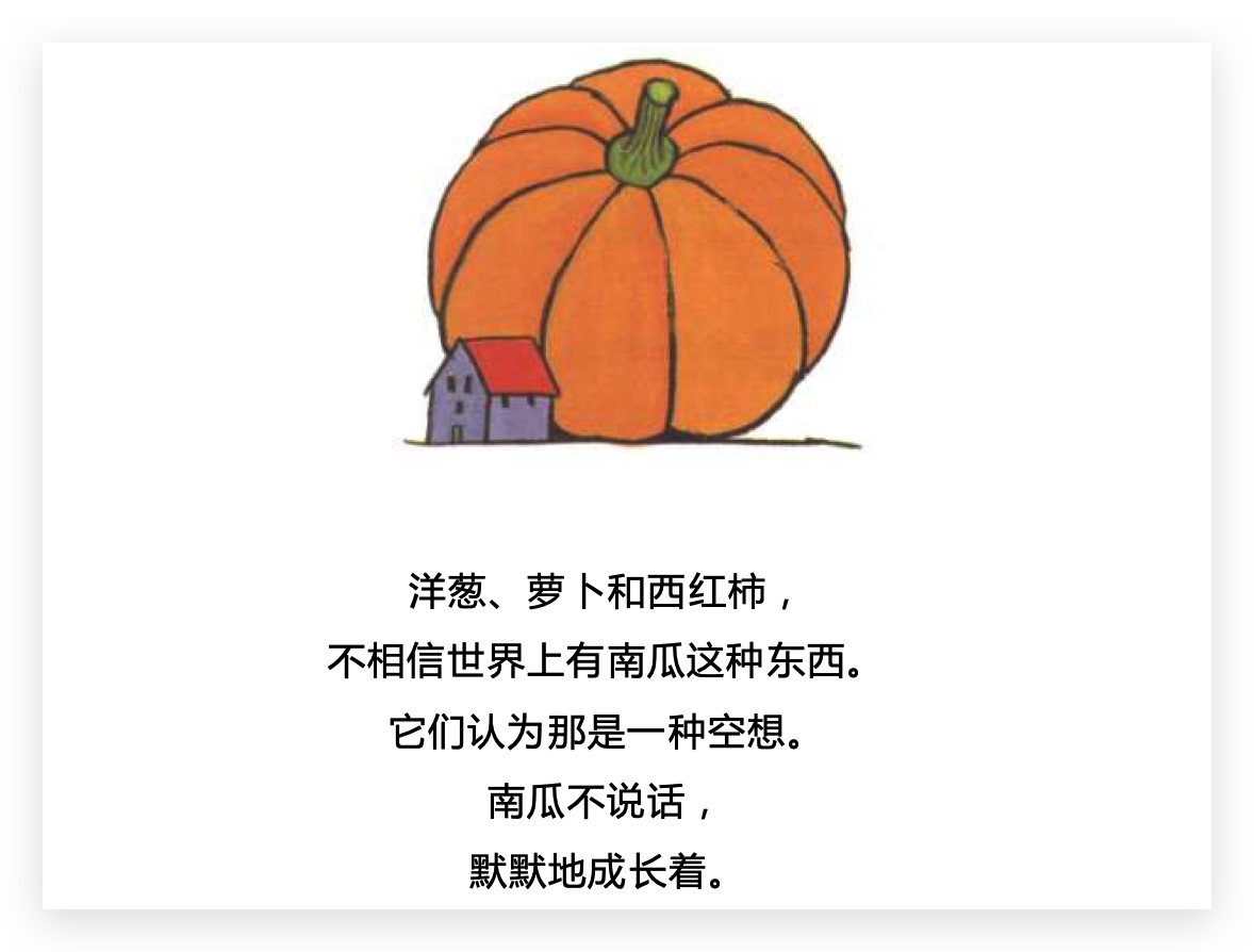 洋葱、萝卜和西红柿,不相信世界上有南瓜这种东西,它们认为那是一种空想,南瓜不说话,默默地成长着。这本童书的最后一个故事就是这样,其它相对较长的故事我说不上特别喜欢,但对这段倒是莫名其妙无法忘怀。